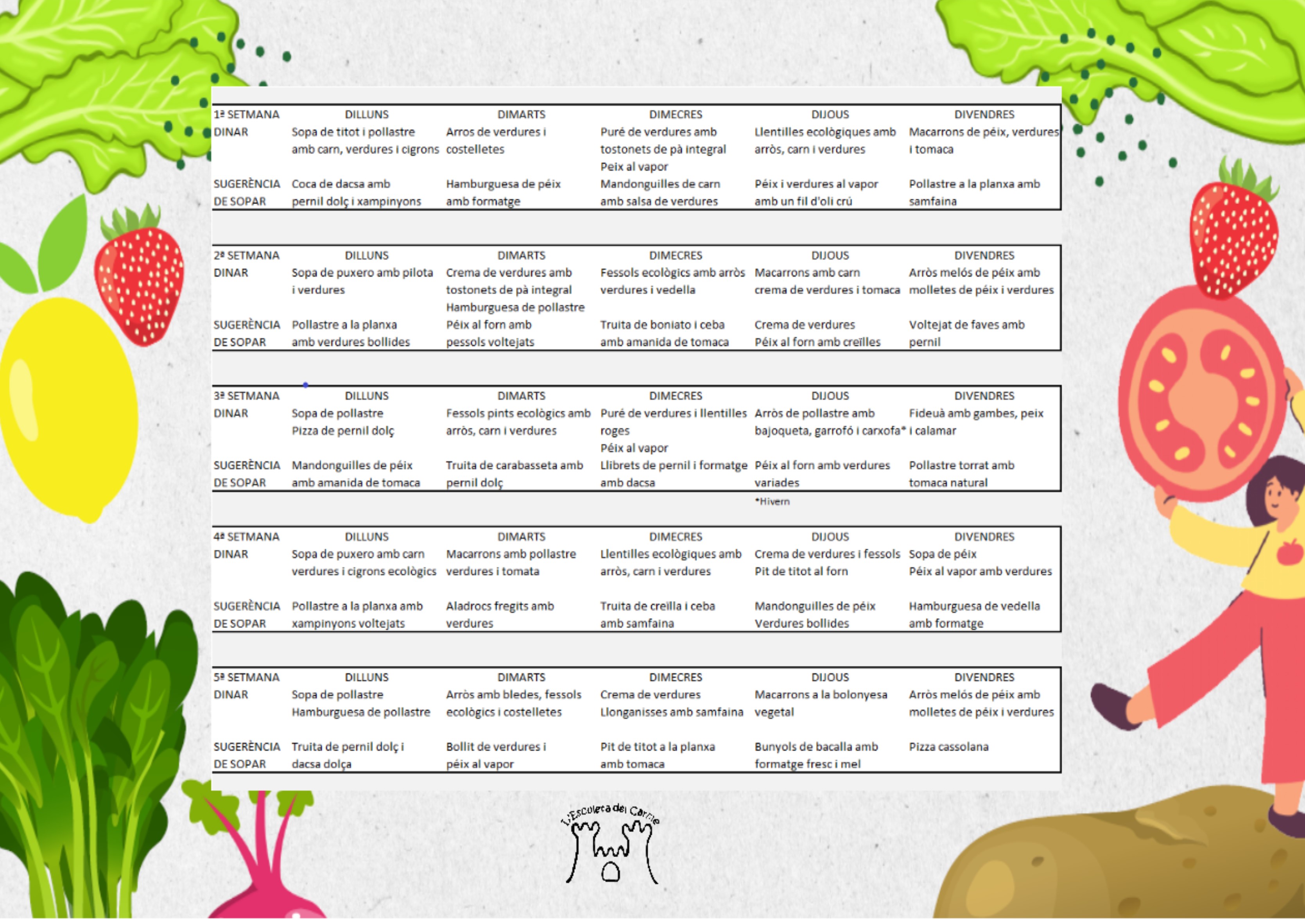 El nostre menú està equilibrat i adaptat a les necessitats nutricionals del grup, i les receptes estàn adaptades a les diverses situacions del nostre alumnat.